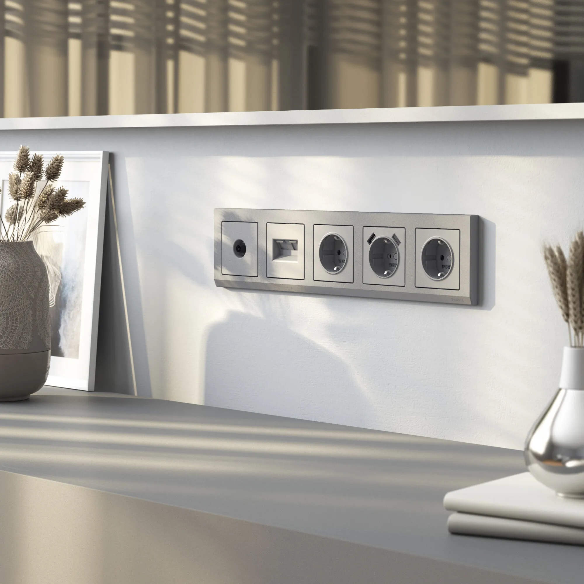 Лаконичная серебряная матовая лицевая панель с бархатистой текстурой не бликует и гармонично сочетается с любыми отделочными материалами. Розетка полностью совместима со всеми рамками Werkel, что позволяет создавать индивидуальные композиции в едином стиле — от минимализма до премиум-дизайна.