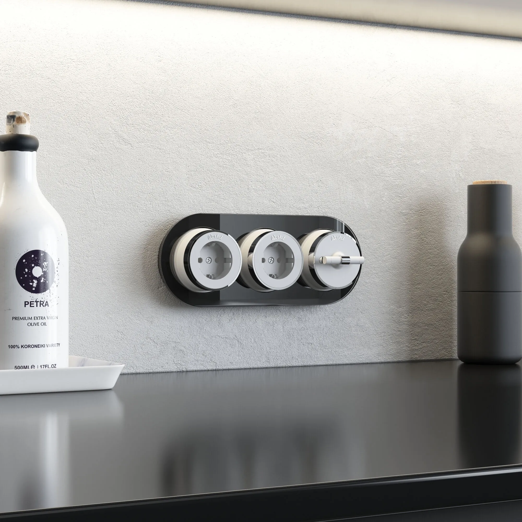Гладкая стеклянная поверхность рамки отражает свет, создавая эффект глубины и объема, что делает ее идеальным фоном для декоративных элементов, таких как ретро переключатели и розетки. Рамка легко монтируется и совместима с различными моделями электроустановочных изделий из коллекций Werkel.
